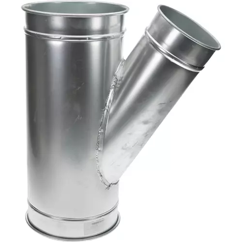 Galvanized branches used for dropping down from above & splitting main line. Long angle reduces suction loss. Made in the USA.
