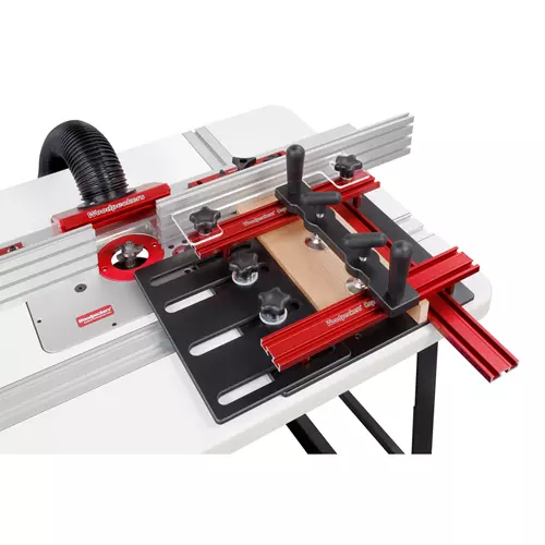 The new Woodpeckers Coping Sled is the router table accessory you need to make rail & style doors, tenons, lap joints, and most other end grain cuts. It is the best way to ensure your board is perpendicular to the router fence and guides smoothly across the router bit. The Woodpeckers Coping Sled uses two techniques to secure the your work piece. First it traps the board between the adjustable top plate and the fence. The slotted top plate is easily adjusted for material up to 5-1/2" wide. Trapping the board this way prevents the router bit from spinning the board. Controlling this rotational force is the most important part of accurately shaping end grain. Second, two clamps hold the piece down to prevent lifting. However very little clamping pressure is needed because the board is trapped as explained earlier.