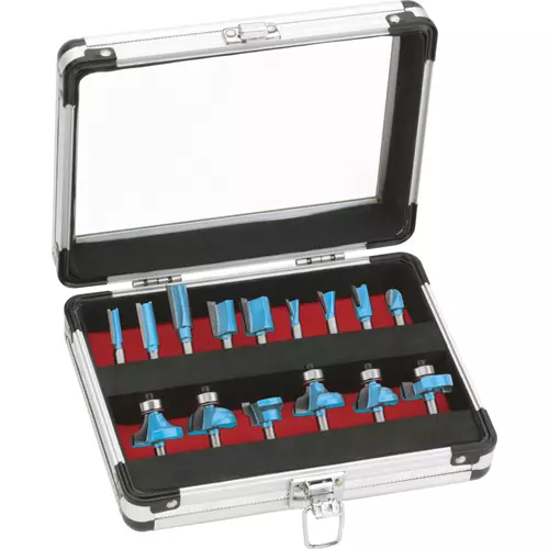 This micro grain, carbide tipped router bit set provides a great selection of commonly used bits. Each bit is displayed in a high-tech, see through aluminum case for the ultimate in protection. 1/4" shank size, lengths range from 1-1/8" and 1-3/8".