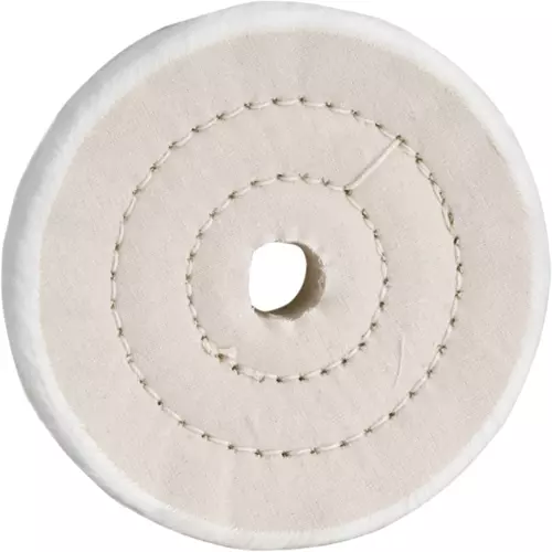 Soft feather-edged muslin is concentrically stiched together near the center, leaving the outer edge to provide a fine polishing surface. Perfect for stainless steel, chrome, gold or silver.