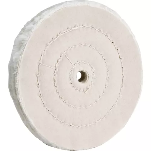 Soft feather-edged muslin is concentrically stiched together near the center, leaving the outer edge to provide a fine polishing surface. Perfect for stainless steel, chrome, gold or silver.