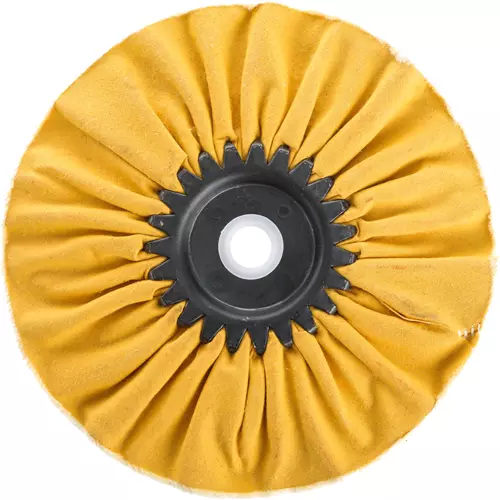 This Hard Airway buff is 100% cotton that's been treated to stiffen the material. The pleats help hold compound. Hard buffs are perfect for removing light scratches in a wide variety of metals.
