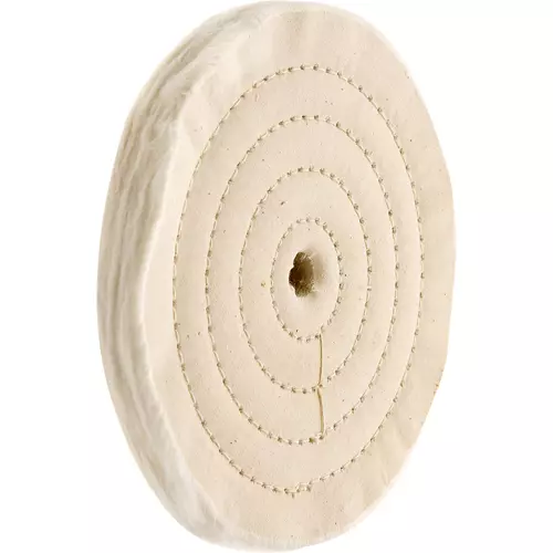 Soft feather-edged muslin is concentrically stiched together near the center, leaving the outer edge to provide a fine polishing surface. Perfect for stainless steel, chrome, gold or silver.