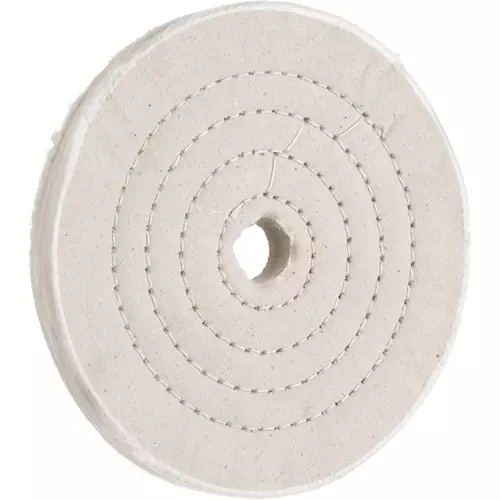 Soft feather-edged muslin is concentrically stiched together near the center, leaving the outer edge to provide a fine polishing surface. Perfect for stainless steel, chrome, gold or silver.