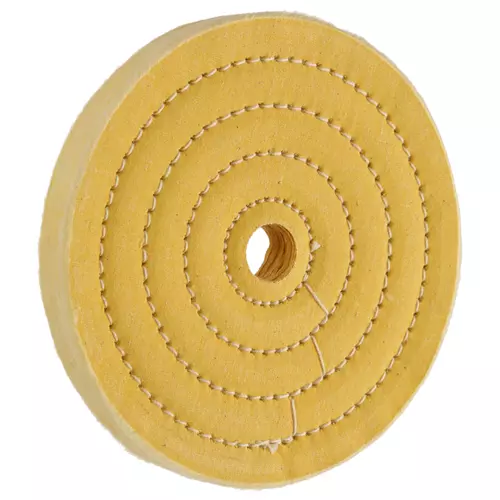 Hard feather-edged muslin is concentrically stitched near the center, leaving the outer edge to provide a fine polishing surface. Perfect for stainless steel, chrome, gold or silver.