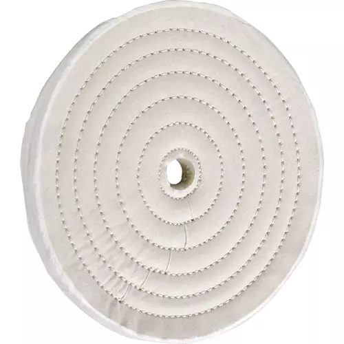 Soft feather-edged muslin is concentrically stiched together near the center, leaving the outer edge to provide a fine polishing surface. Perfect for stainless steel, chrome, gold or silver.