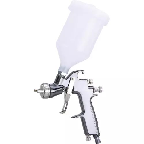 Low volume, low pressure spray gun with 600 ml gravity feed cup saves material costs and has an adjustable spray pattern and two stage trigger. The gun disassembles for easy cleaning. Includes an extra internal filter, clean up brush and service wrench. 1.5mm fluid tip.
