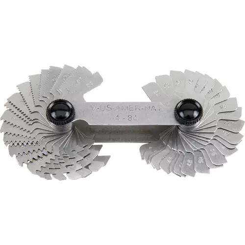 This is a very handy tool used for determining the thread pitch of a bolt, tapped hole, nut or screw thread insert. This screw pitch gauge helps to insure you get the right part the first time and allows the user to easily identify 52 different sizes including 4-1/2, 5-1/2 and 11-1/2 TPI. Sizes #4-84.