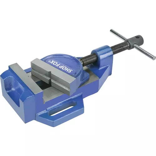 Precision-milled cast-iron Tilting Jaw Drill Press Vise features a tilting head that allows the vise to clamp any nonparallel part and automatically equalize the pressure. A large knurled handle allows quick adjustments and includes a bi-positional bar handle for plenty of torque. Both jaws have horizontal and vertical grooves for holding round stock. Includes a sturdy lip along both sides of the base, allowing vise to be mounted to nearly any machine table, using common T-slot clamps.